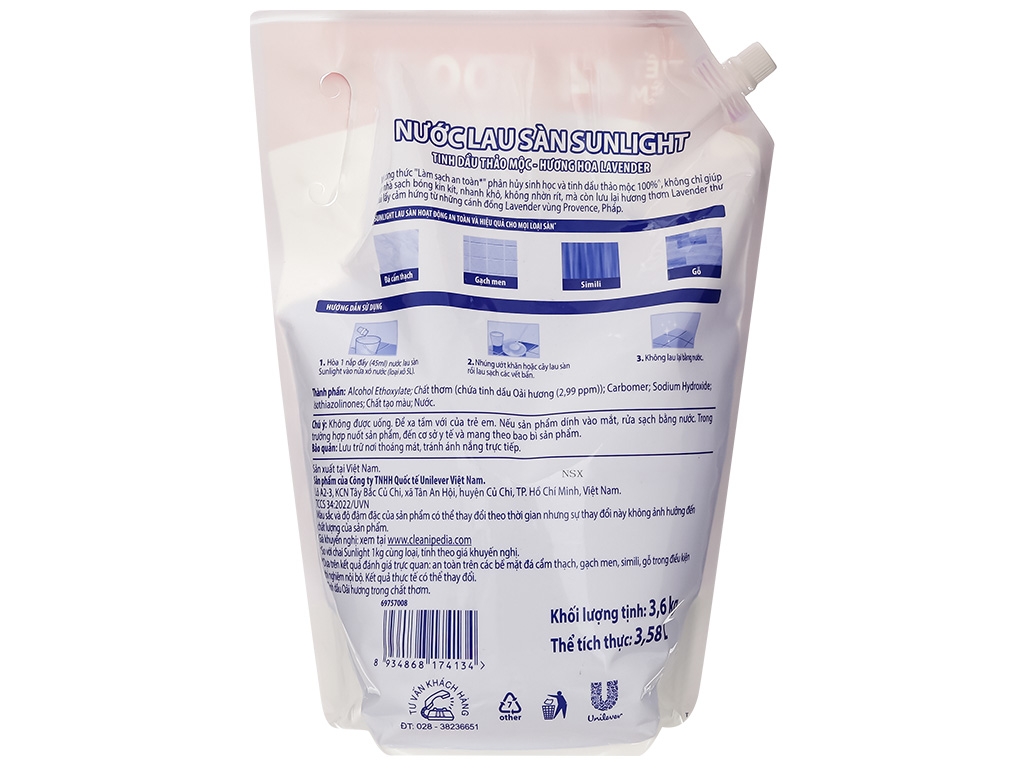 Nước lau sàn Sunlight tinh dầu thảo mộc hương lavender túi 3.6kg với giá cả phải chăng cùng dạng túi lớn sử dụng dễ dàng và tiết kiệm. Nước lau sàn Sunlight là một trong những thương hiệu nước lau sàn nổi tiếng tại nước ta với khả năng làm sạch nhiều bề mặt sàn, an toàn cho sức khỏe.