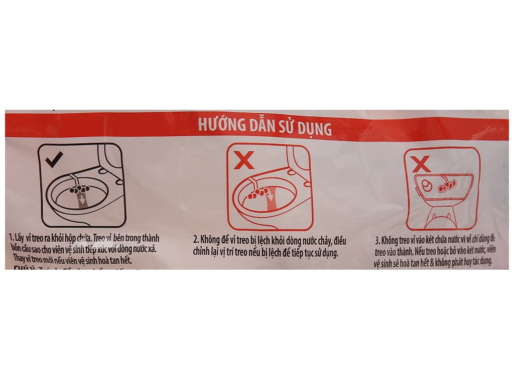 Treo ở phía trong thành bồn cầu sao cho viên vệ sinh tiếp xúc với dòng chảy nước xả.